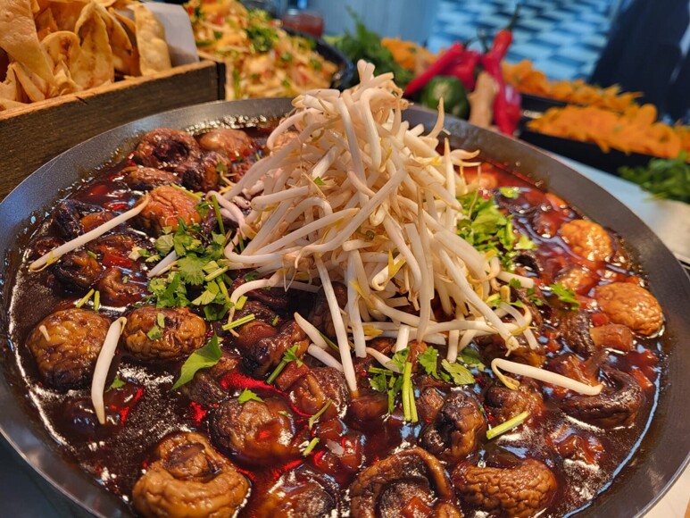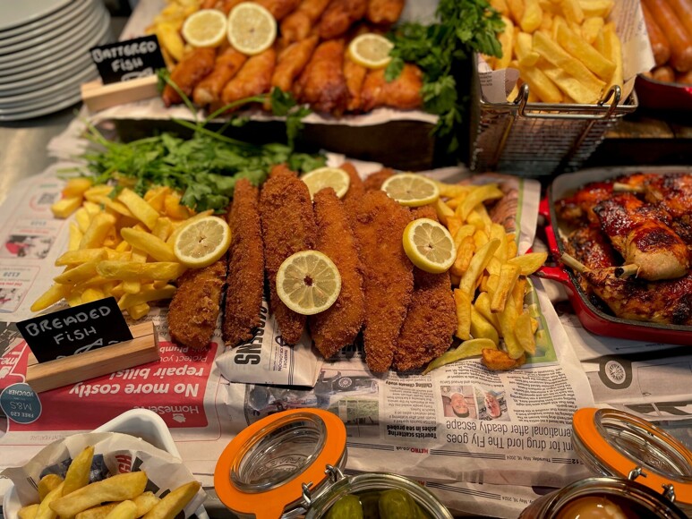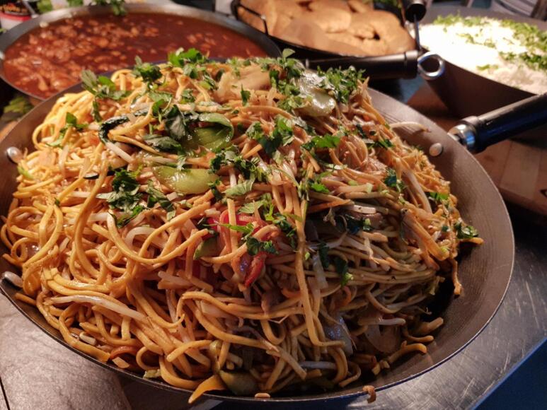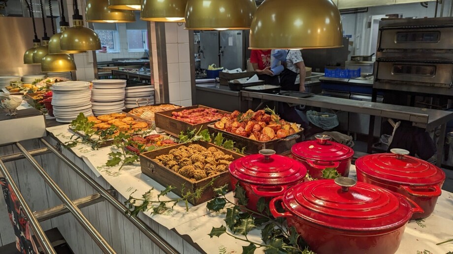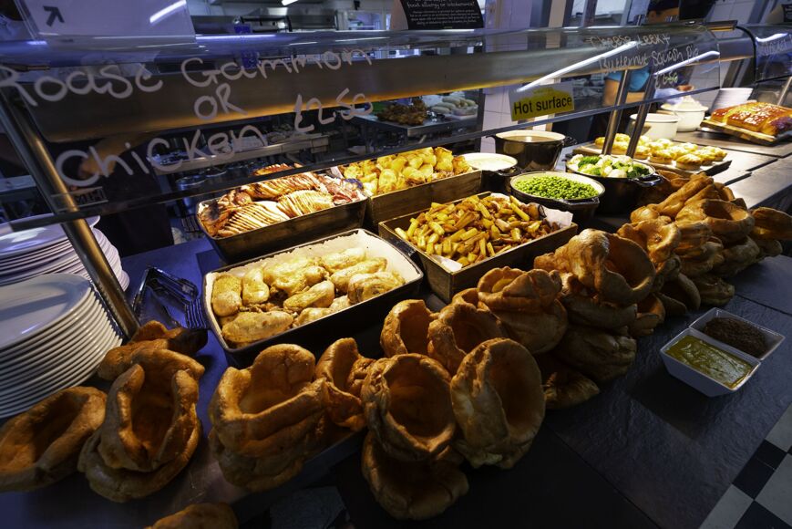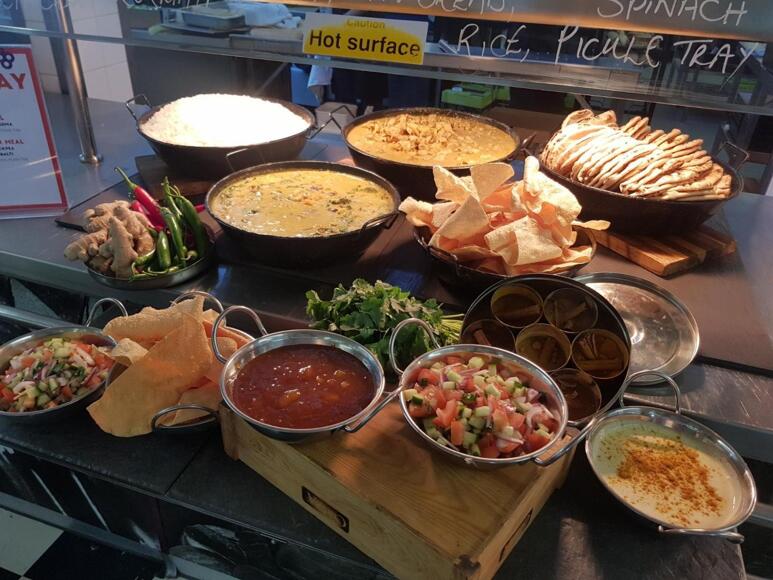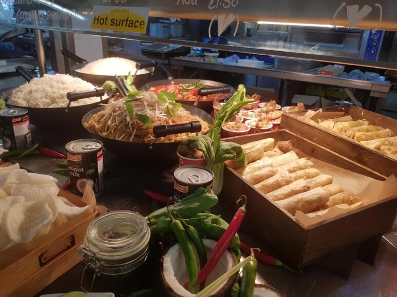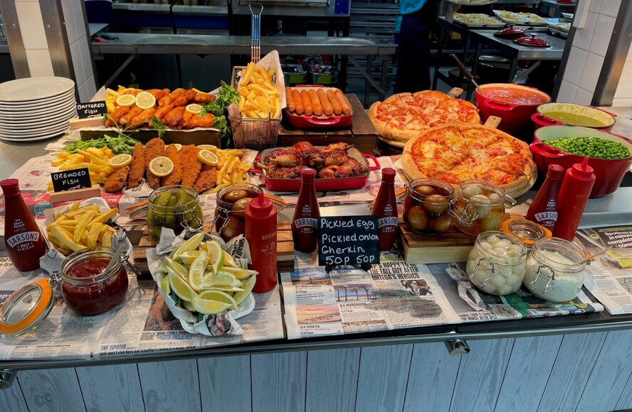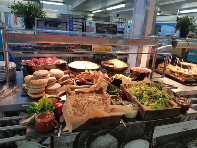Main meals including roast dinner, curry, fish and chips. Hot puddings, soup, street food options, pizza, jacket potatoes, pasta, burgers and sandwiches. Salad bar, fruit and drinks.