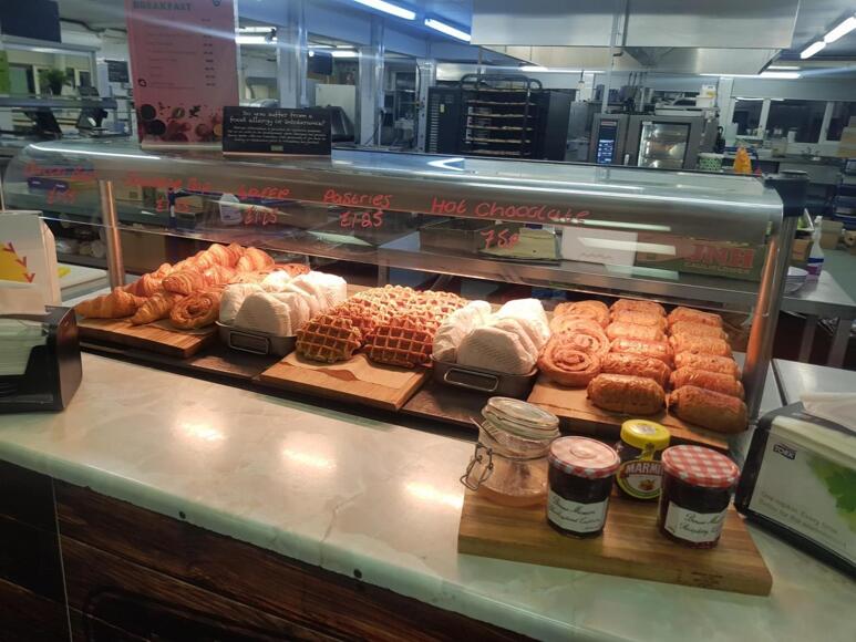Hot and cold breakfast including porridge, hot chocolate, pastries, cereals, fruit, bacon/sausage rolls.